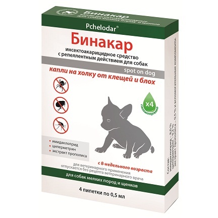 Бинакар относится к инсектоакарицидным препаратам. Имидаклоприд, входящий в состав препарата, обладает выраженным инсектицидным действием на вшей, блох и власоедов, паразитирующих на собаках и кошках, обеспечивая защитное действие от двукрылых насекомых на протяжении 4 недель после однократной обработки. Механизм действия имидаклоприда основан на взаимодействии с ацетилхолиновыми рецепторами членистоногих и нарушении передачи нервных импульсов, что вызывает гибель насекомых. Циперметрин относится к пиретроидам второго поколения. Воздействует на центральную и периферийную нервную системы насекомых. Имидаклоприд и циперметрин обладают синергидным (взаимоусиливающим) эффектом против иксодовых и чесоточных клещей, блох, вшей, власоедов и других насекомых (комаров, мошек и москитов). Уничтожают насекомых в имагинальных (взрослых) и преимагинальных (личиночных) стадиях развития, а также защищают животное от их нападения. Оказывают системное, контактное и репеллентное действие на иксодовых клещей, паразитирующих на собаках и кошках. Экстракт прополиса, обладающий выраженным противовоспалительным, бактерицидным, успокаивающим и ранозаживляющим действием, защищает кожу животного от раздражения. После нанесения на кожу препарат распределяется по поверхности тела, в незначительной степени резорбируется кожей, что обеспечивает его длительное инсектоакарицидное и репеллентное действие. По степени воздействия на организм относится к малоопасным веществам (4 класс опасности по ГОСТ 12.1.007-76), при нанесении на кожу в рекомендуемых дозах не оказывает раздражающего, резорбтивно-токсического, эмбриотоксического, тератогенного, мутагенного и сенсибилизирующего действия. Препарат хорошо переносится собаками в терапевтической и в 5 раз её превышающей дозе.