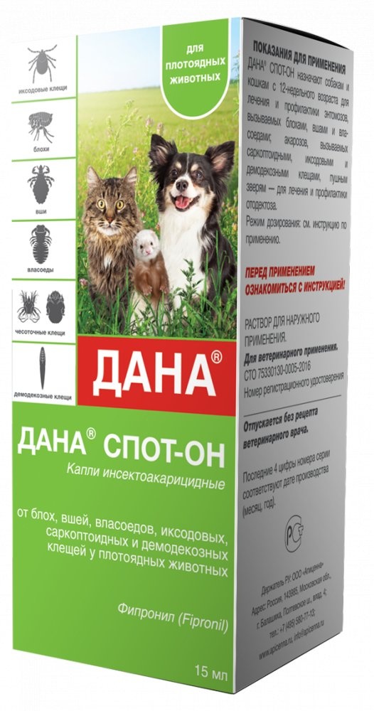 Дана Спот-он относится к инсектоакарицидным препаратам группы фенилпирозолов. Фипронил, входящий в состав лекарственного препарата, обладает выраженной инсектоакарицидной активностью в отношении преимагинальных и имагинальных фаз развития блох (Stenocephalides canis, Stenocephalides felis) вшей (Linognatus setotus), власоедов (Trichodectes canis), саркоп- тоидных (Sarcoptes canis, Sarcoptes vulpis, Notoedres cati, Otodectes cynotis, Psoroptes cuniculi), иксодовых (Ixodes ricinus, Rhipicephalus sanguineus, Dermacentor reticulatus, Ixodes scapularis, Dermacentor variabilis) и демодекозных (Demodex canis) клещей. Механизм действия фипронила заключается в блокировании ГАМК-зависимых рецепторов членистоногих, нарушении передачи нервных импуль- сов, что приводит к параличу и гибели насекомых и клещей. После нанесения препарата на кожу фипронил, практически не всасываясь в системный кровоток, распространяется по кожно-волосяному покрову животного, накапливается в эпидермисе, волосяных луковицах и сальных железах, оказывая контактное инсектоакарицидное действие, которое проявляется через 12 – 24 часа и продолжается на протяжении 4 – 6 недель после однократной обработки животного. Дана Спот-он по степени воздействия на организм относится к малоопасным веществам (4 класс опасности по ГОСТ 12.1.007-76), в рекомендуемых дозах не оказывает кожно-раздражающего, кожно-резорбтивного и сенсибилизирующего действия, при попадании в глаза вызывает слабое раз- дражение. Препарат токсичен для кроликов, пчел, а также рыб и других гидробионтов.