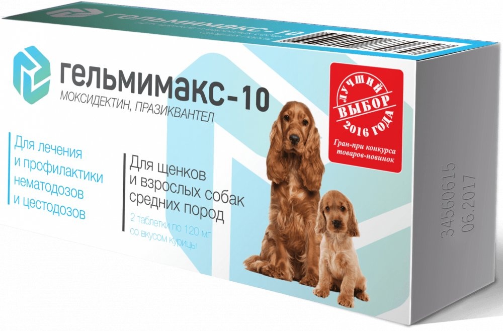 ГЕЛЬМИМАКС-10 для щенков и взрослых собак средних пород, 2 таблетки * 120 мг