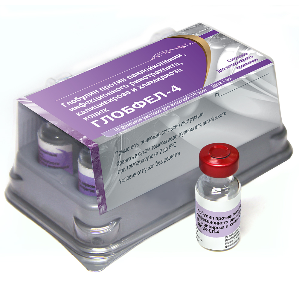 Глобфел – это гамма- и бета- глобулиновые фракции сыворотки крови животных, гипериммунизированных антигенами возбудителей панлейкопении, инфекционного ринотрахеита, калицивироза и хламидиоза кошек.