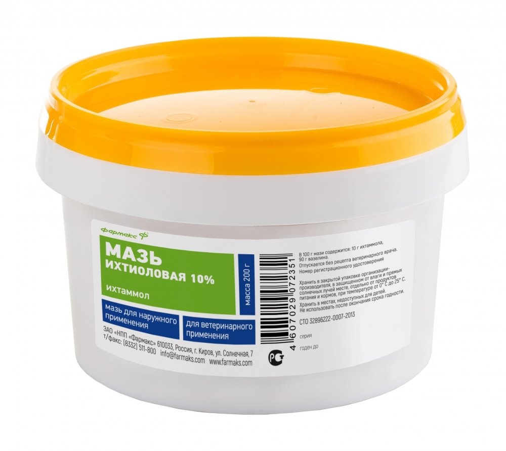 Мазь ихтиоловую 10 % применяют животным (кроме кошек) для лечения заболеваний кожи (ожогов, ран, экзем, дерматитов).