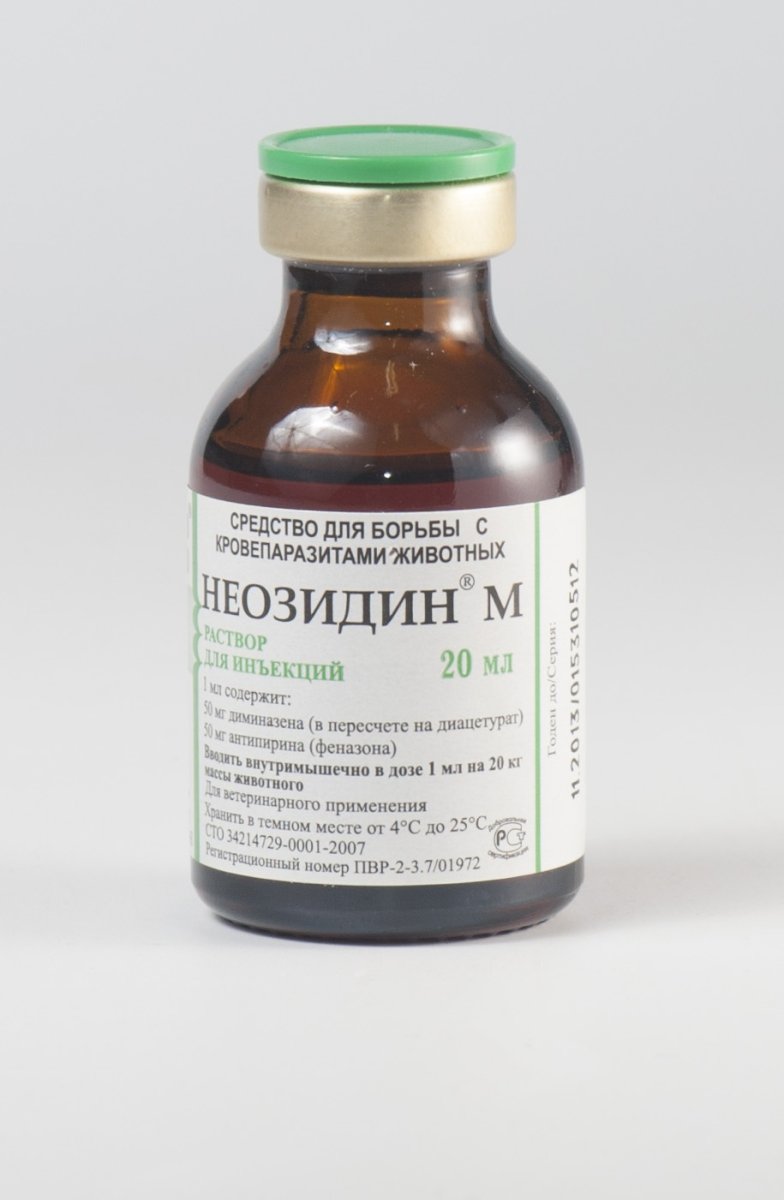 Неозидин М вводят животным внутримышечно однократно из расчета 1 мл препарата на 20 кг массы животного. В случаях, если у больных животных после первого введения препарата не отмечается снижение температуры и улучшения общего состояния, допускается повторное использование Неозидина М в той же дозе через 24 часа. Собакам препарат применяют дробно в два приема с интервалом 1 – 2 часа или в один прием, при условии разведения рассчитанного для введения животному объема раствора Неозидина М стерильным растворителем (дистиллированная вода, физиологический раствор) в соотношении 1:1. Одновременно с Неозидином М собакам рекомендуется введение антигистаминных лекарственных средств в соответствии с инструкциями по применению. Больным животным предоставляют покой и дополнительно используют в зависимости от физиологического состояния симптоматические средства (сердечные, слабительные, витамины, микроэлементы). С профилактической целью при обнаружении в стаде одного или нескольких животных с клиническими признаками болезни, а также после перегона животных в неблагополучную по кровепаразитарным заболеваниям местность, Неозидин М применяют однократно в терапевтической дозе, при необходимости инъекцию повторяют в той же дозе через 10 – 15 дней. Если рассчитанный объем вводимого раствора превышает 10 мл, то, во избежание болевого эффекта, раствор следует вводить животному в несколько мест. Перед массовой обработкой животных каждую серию Неозидина М предварительно испытывают на небольшой группе (5 – 10 голов) животных. При отсутствии в течение 3 суток осложнений, обрабатывают все поголовье.