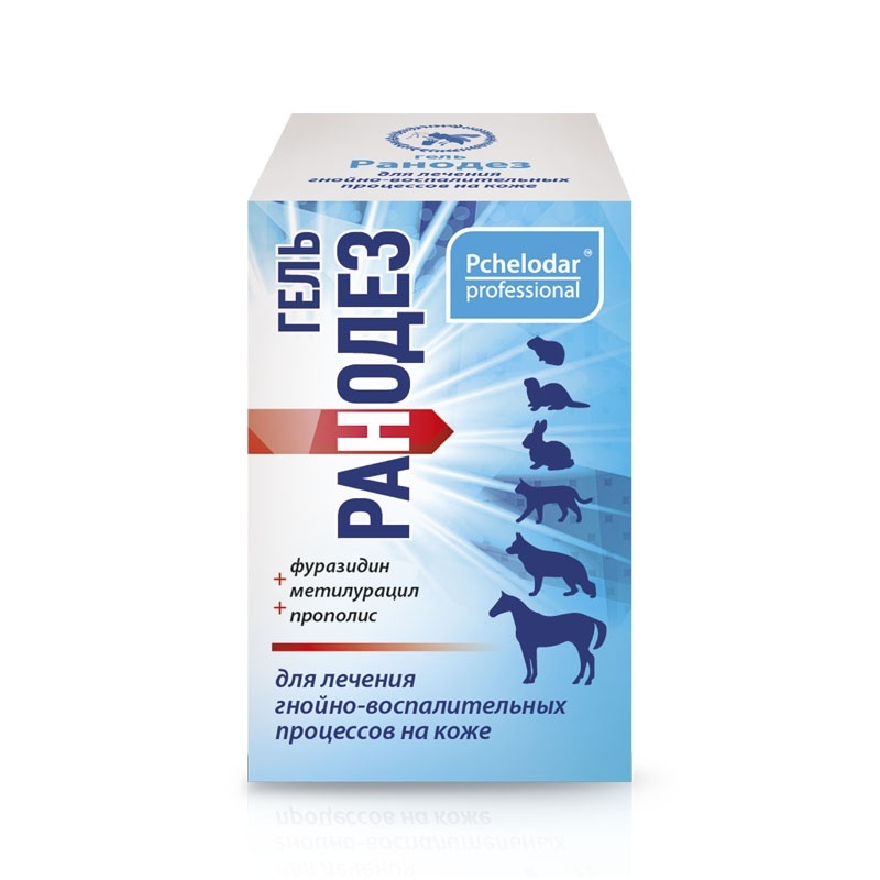 Ранодез гель предназначен для лечения и предупреждения гнойно-воспалительных процессов на коже и слизистых оболочках, а также для обработки операционного поля у животных. Действующее вещество, фурагин растворимый, является производным нитрофурана, оказывает выраженное антибактериальное действие в отношении грамположительных и грамотрицательных бактерий (Staphylococcus epidermidis, Staphylococcus aureus, Staphylococcus faecalis, Enterobacteriace- ae, Escherichia coli, Klebsiella pneumoniae и другие), в присутствии гноя, крови, сыворотки не снижает бактериостатическую активность. Метилурацил является иммуностимулирующим средством, ускоряет процессы регенерации и заживления ран, стимулирует клеточные и гуморальные факторы защиты, обладает выраженным противовоспалительным действием. Экстракт прополиса оказывает сильное противомикробное, противогрибковое, обезболивающее и ранозаживляющее действие на кожу животного, усиливает антибактериальное свойство фурагина растворимый.