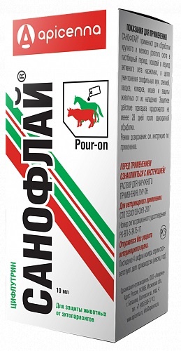 В качестве действующих веществ Санофлай в 1 мл содержит: цифлутрин – 10 мг, вспомогательные вещества до 1 мл.